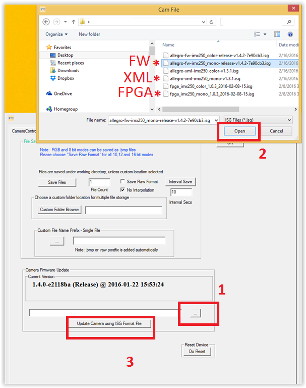 - Browse for the fpga update file <fpga_imx250_mono_1.0.3_2016-02-08-15>